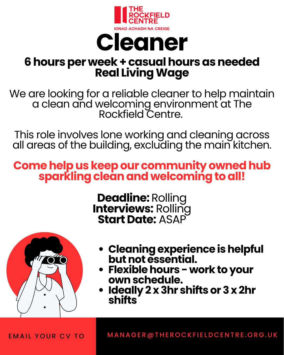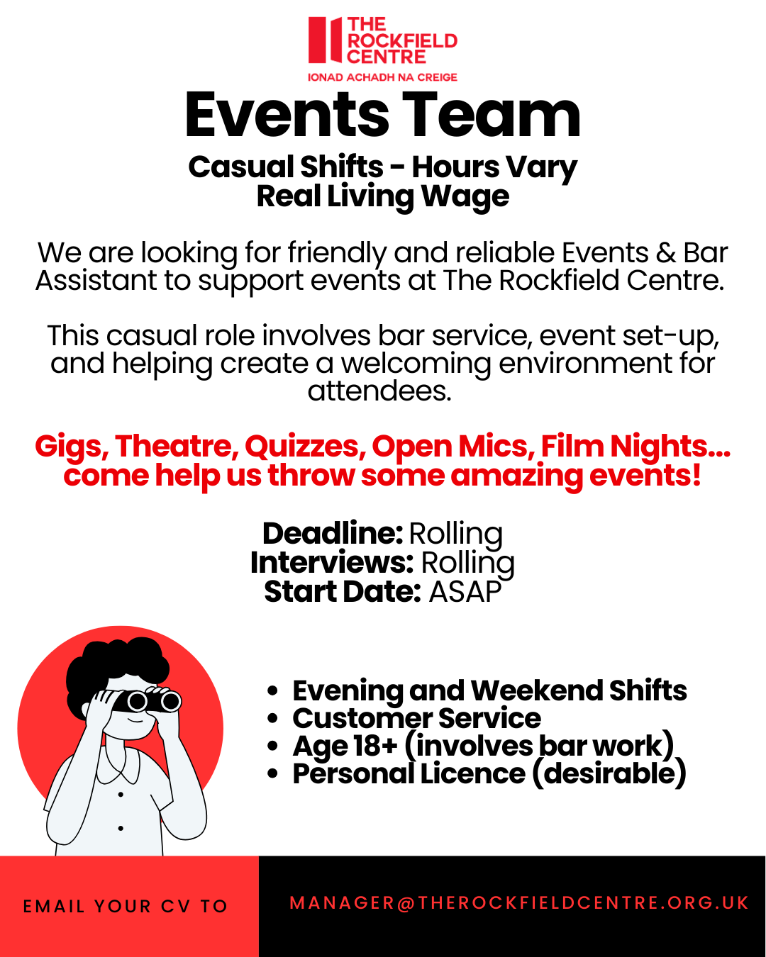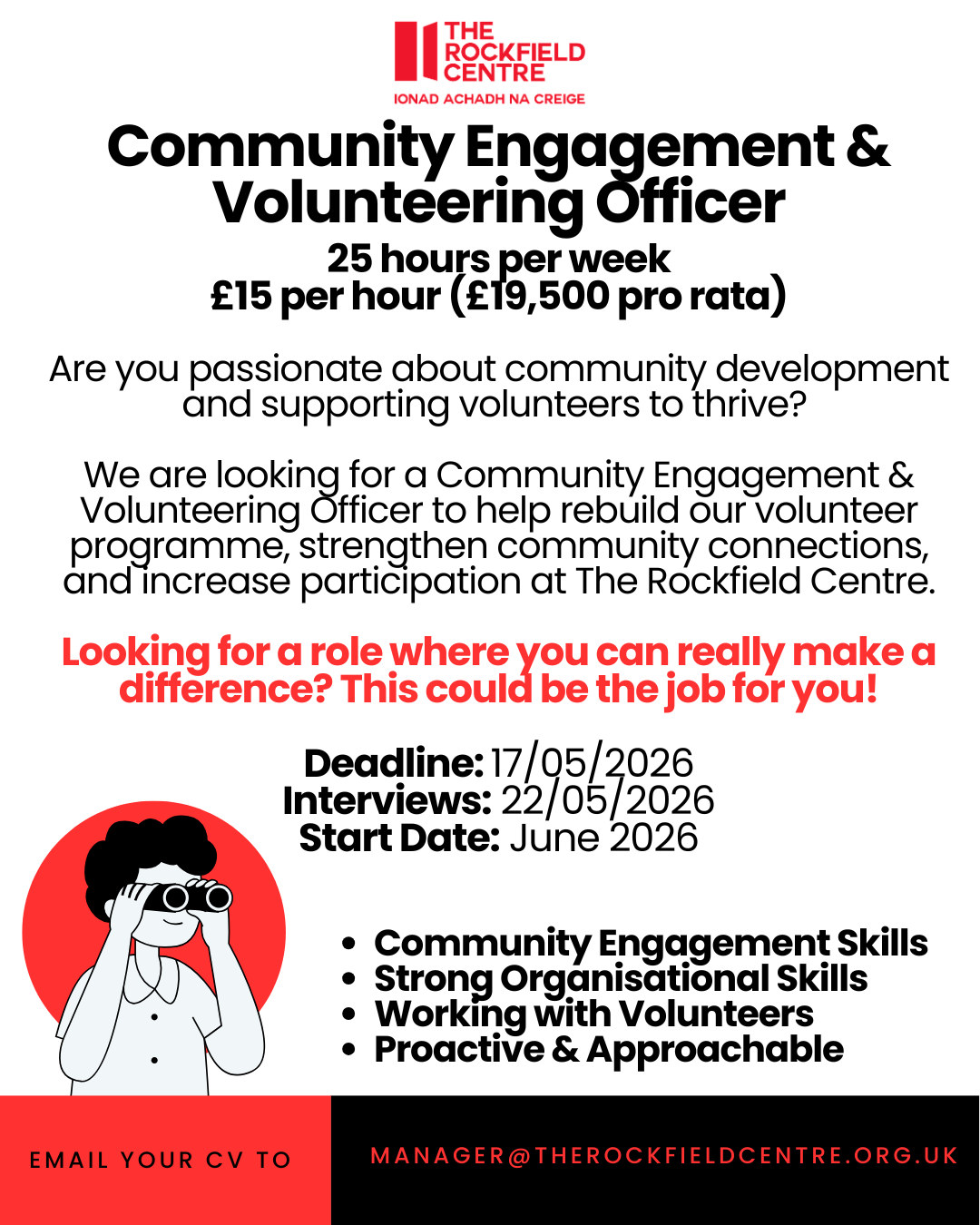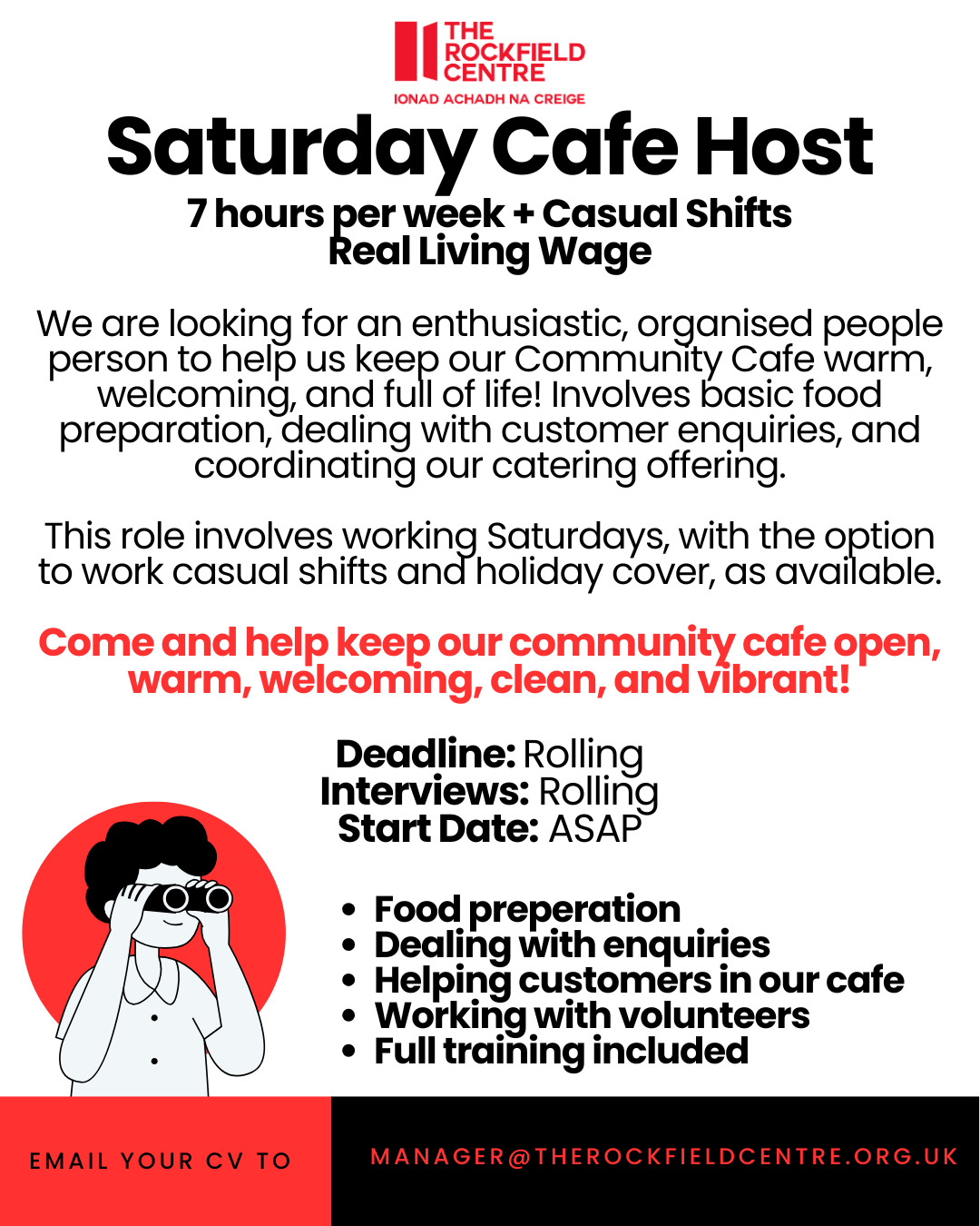 Current Vacancies We are hiring! Click on the job advert for a full job description. Email manager@therockfieldcentre.org.uk to apply! Looking for a different role?Follow us on our socials to hear first